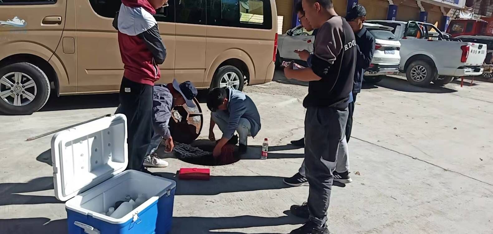 南木林縣污水處理廠工作人員和上級領(lǐng)導(dǎo)一起排查污水管網(wǎng)